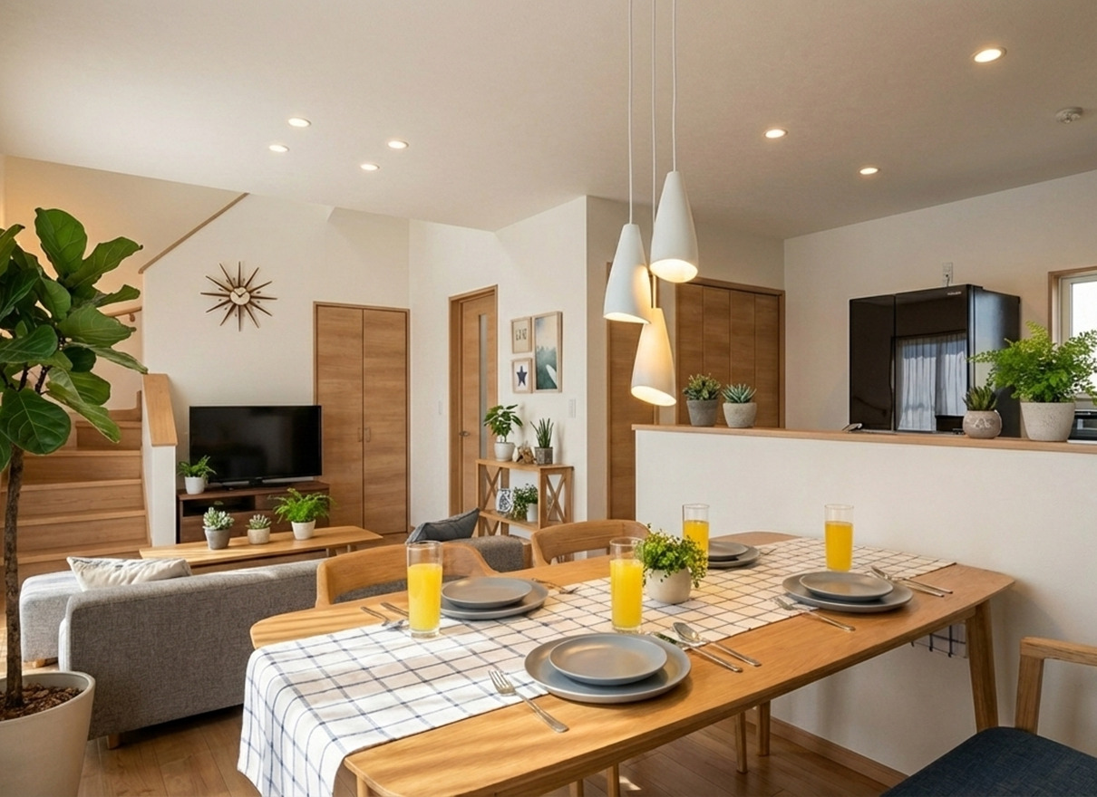 リビング階段を採用し、家族の気配が自然につながる空間です。