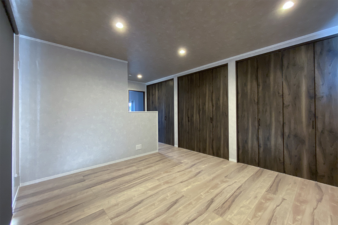 壁一面に設けられた大容量クローゼットは、衣類だけでなく季節家電や布団などもすっきり収まる設計。散らかりがちな寝室も、常に整った快適な空間を保つことができます。