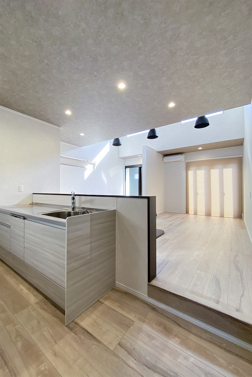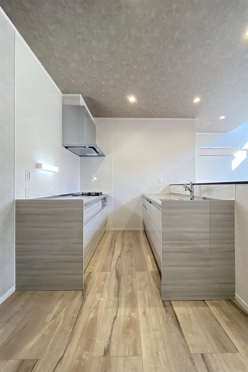 リビング側からは、すっきりとしたキッチン全体を見渡せる間取り。生活感を抑えつつも、家族のコミュニケーションが自然と生まれる配置となっています。