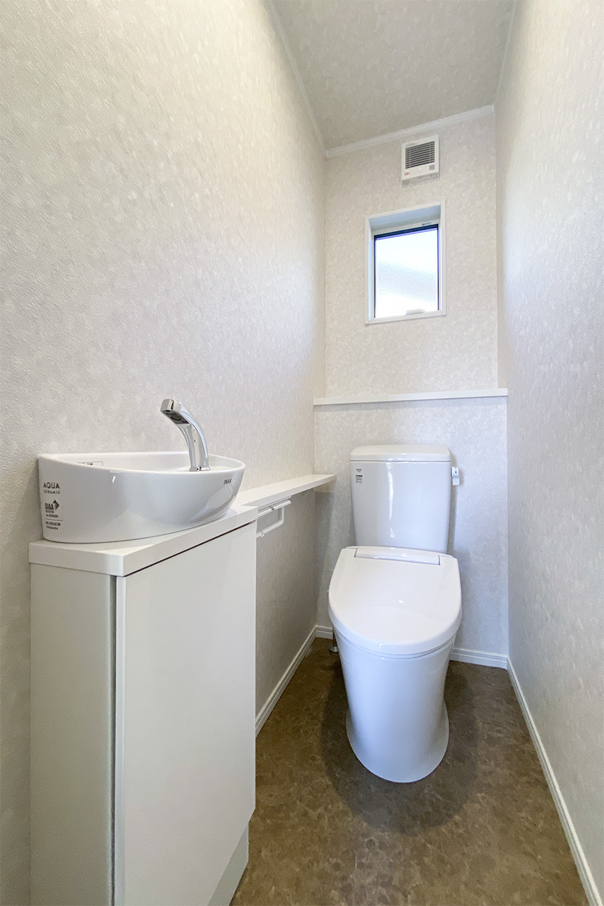 コンパクトながらも清潔感のあるトイレ空間。小窓からの自然光とシンプルな内装で、毎日安心して使える落ち着いた雰囲気を演出しています。