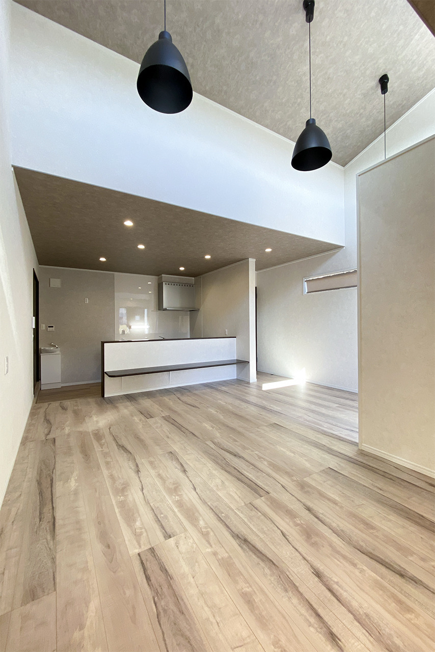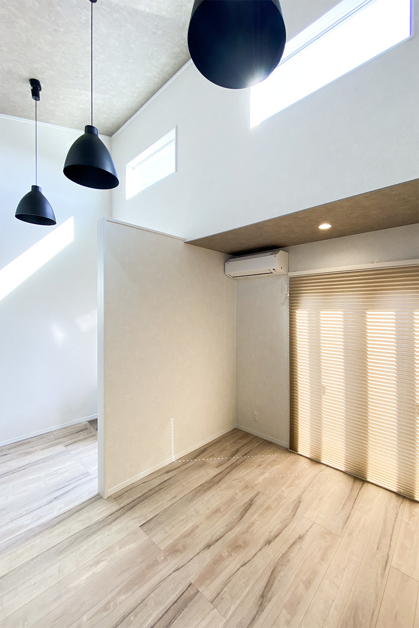 高窓から光を取り込む勾配天井は、季節を通じて室内を明るく快適に。デザイン性と機能性を兼ね備え、住まい全体に広がりをもたらします。