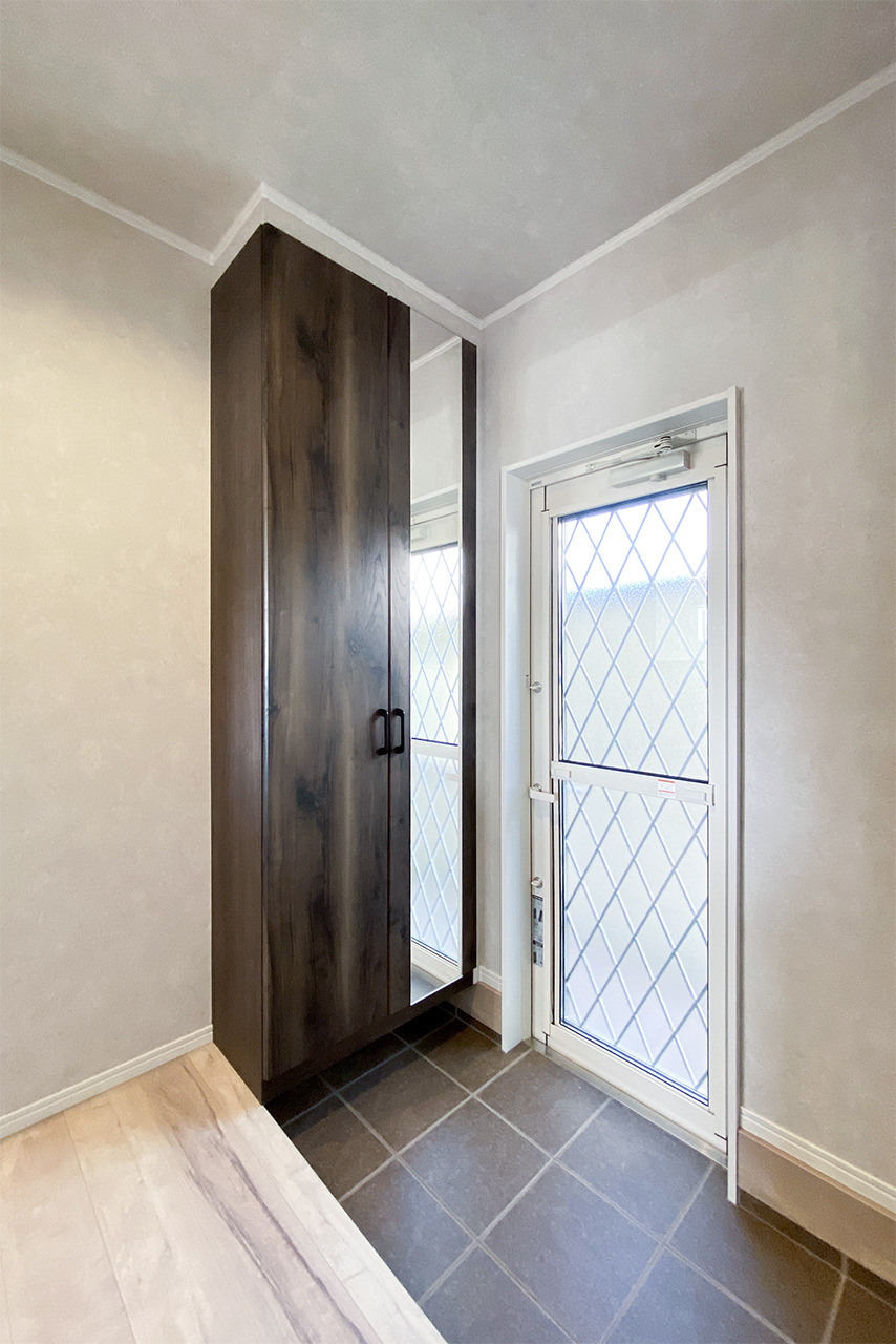 玄関には大型の収納と全身ミラーを備え、靴や小物をスマートに整理。外出前に姿を確認できるため、日々の暮らしに安心感と機能性をプラスしています。