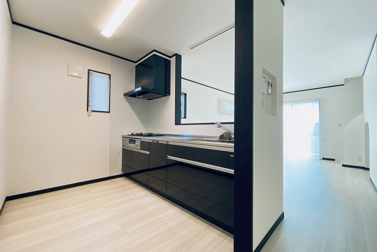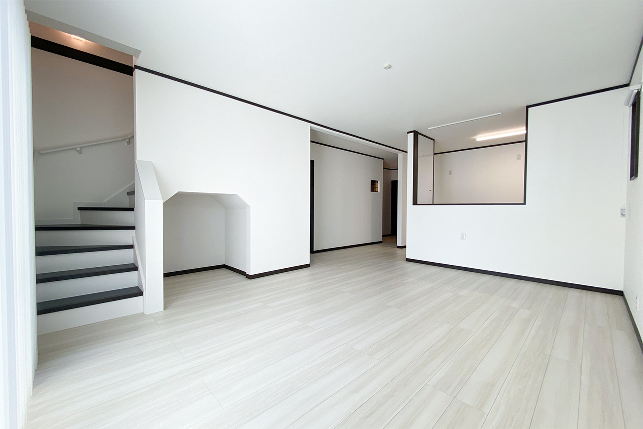 白を基調にまとめた室内に、ダークカラーの建具やキッチンがほどよいアクセント。階段やキッチン、奥の空間までがゆるやかにつながり、開放感がありながらも暮らしにメリハリをつくれるレイアウトです。
