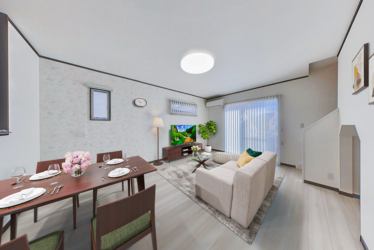 ダイニングからリビングまで視線がすっと抜ける、のびやかなLDKです。リビング階段を取り入れることで、帰宅や外出の気配も自然に伝わり、日々の会話が生まれやすい間取りになっています。