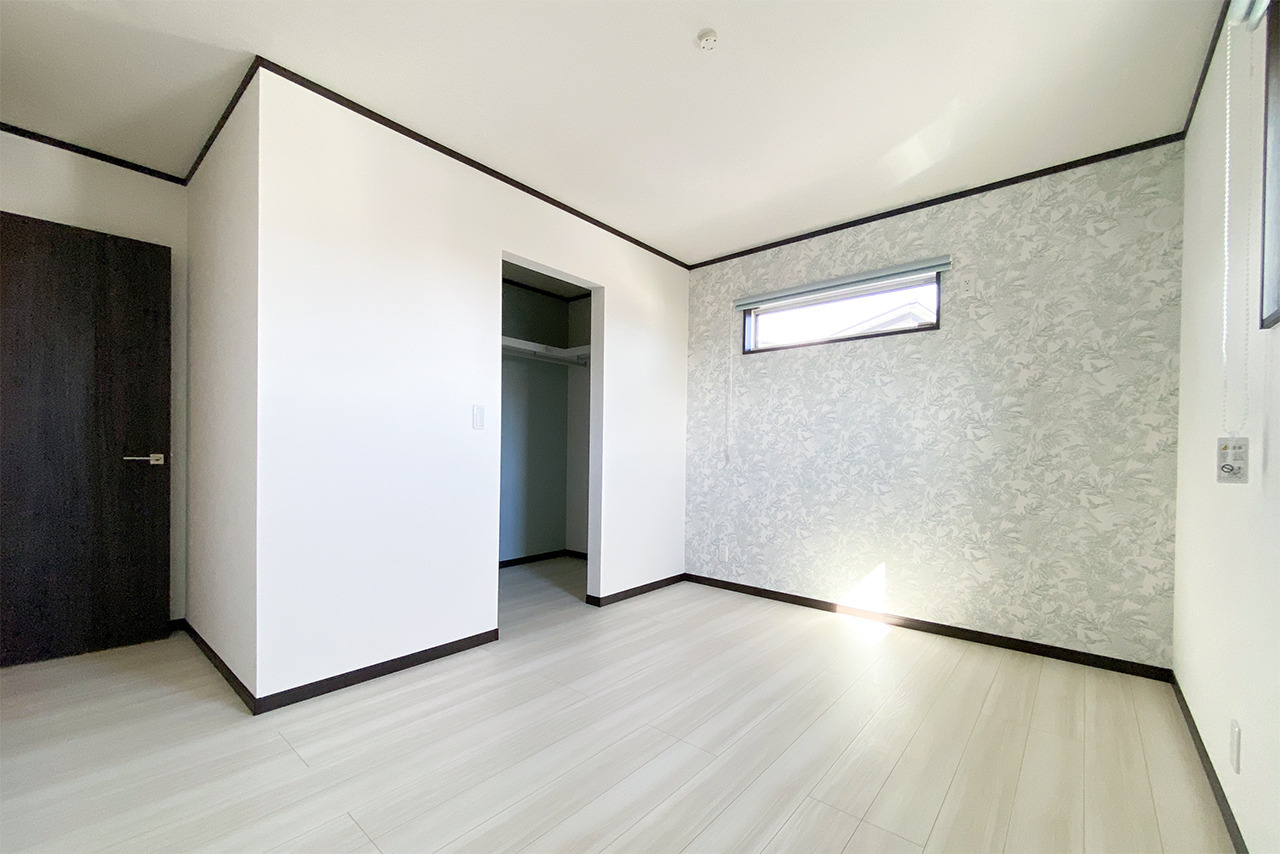 隣接するウォークインクローゼットとあわせて使える、使い勝手のよい洋室です。アクセントクロスが空間にやわらかな表情を添え、すっきりとした中にも落ち着きを感じられる仕上がりになっています。