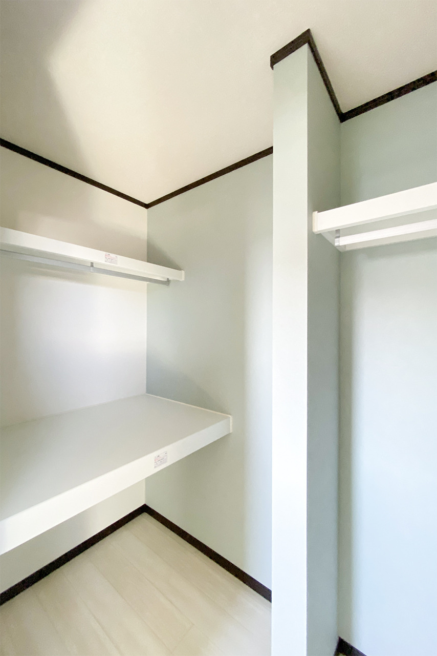 玄関ホールのすぐそばに設けたウォークインクローゼットは、外出着や持ち物の出し入れがしやすい便利な位置。枕棚とパイプを組み合わせることで、掛ける収納と置く収納の両方に対応し、玄関まわりをすっきり保ちやすくしています。