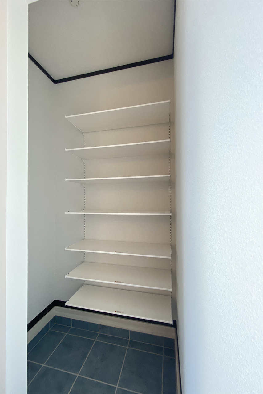 可動棚を備えたエントランス収納は、靴だけでなく、玄関まわりで使う小物の整理にも便利です。土間続きで使いやすく、必要なものをさっと出し入れできるため、毎日の出入りがよりスムーズになります。
