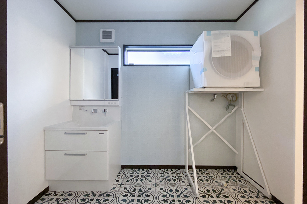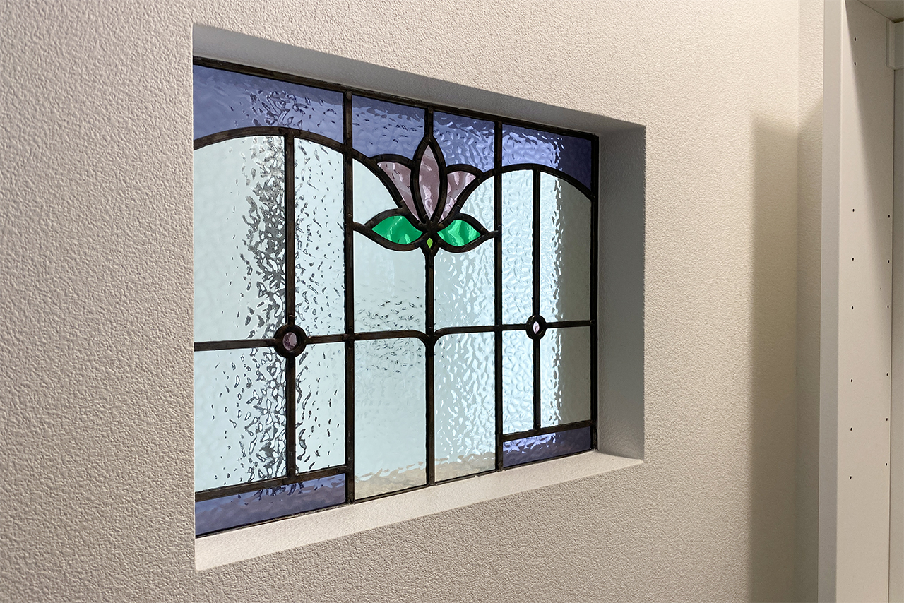 洗面脱衣室の手前に設けた洗面化粧台は、帰宅後の手洗いや朝の身支度をスムーズにしてくれる配置です。壁に埋め込まれたステンドグラスがやさしい彩りを添え、実用性の中にさりげない個性も感じられます。